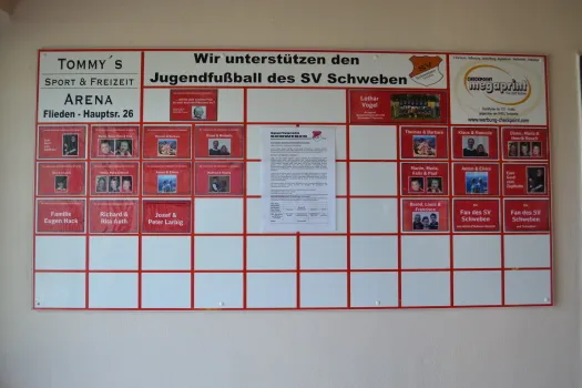 Jeder, der diese Aktion begleiten möchte, bekommt ein Werbeschild mit seinem Foto und einem Aufdruck seiner Wahl, auf der großen Werbetafel in unserem Sporthaus. Damit verbunden ist eine finanzielle Unterstützung von etwa 5,00€ monatlich, jedoch sind für den Betrag nach oben keine Grenzen gesetzt. Zum Jahresende wird für den gezahlten Förderbeitrag eine Spendenbescheinigung erstellt. Um den Aufwand so gering wie möglich zu halten, würden wir gerne den Betrag - euer Einverständnis vorausgesetzt - direkt vom Konto abbuchen. Durch die Teilnahme zeigt Ihr zum einen eure enge Verbundenheit mit unserem Fußballverein, zum anderen unterstützt Ihr die vielfältigen Aufgaben im Jugend-, aber auch im Seniorenbereich mit den notwendigen finanziellen Mitteln. Mit einem verhältnismäßig geringen monatlichen Betrag sichert ihr die Weiterentwicklung unseres Sportvereines.